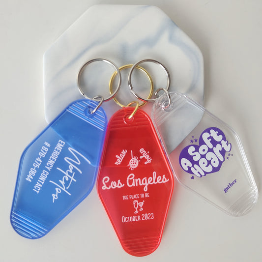 Collection: Motel Key Chains Custom Logo, Text, Names and Numbers.
